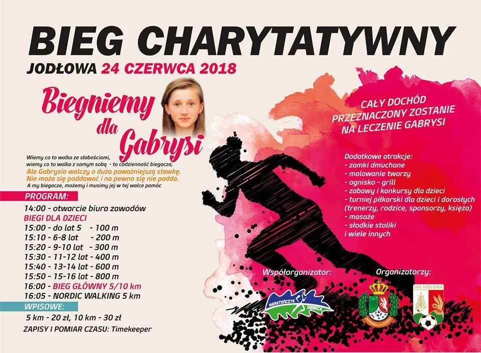 – Całkowity dochód z biegu zostanie przeznaczony na leczenie chorej Gabrysi. Tuż przed biegiem głównym rozegrane zostaną także biegi dla dzieci na dystansie od 100 do 800 metrów. Odbędzie się również marsz nordic walking. Imprezie będą towarzyszyły m.in.gry i zabawy dla dzieci, turniej piłkarski grill. Serdecznie zapraszamy wszystkich sympatyków biegania do Jodłowej – mówi Mariusz Kłusek, organizator imprezy.