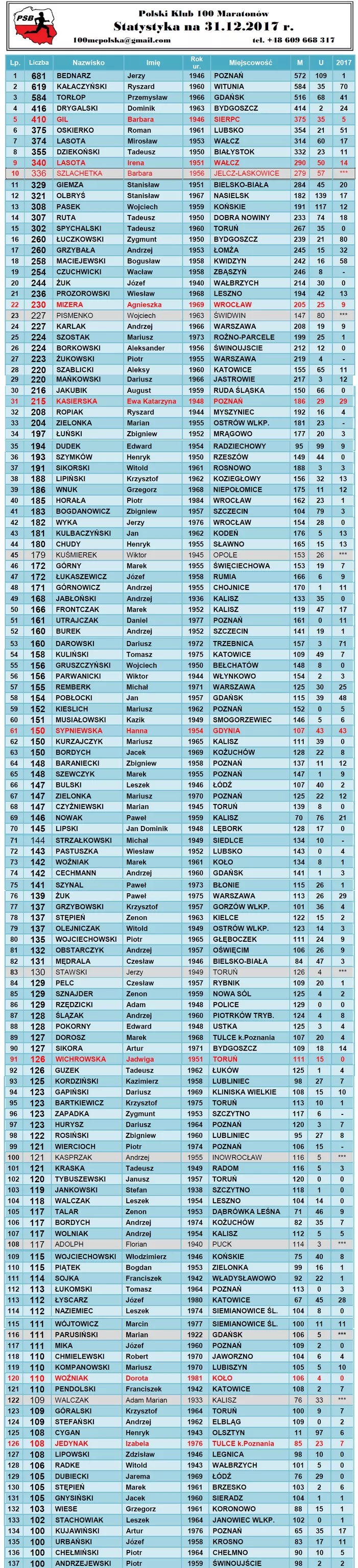 Polski Klub 100 Maratonów zaktualizował listę biegaczy, którzy ukończyli co najmniej 100 biegów na dystansie 42,195 km lub dłuższym.