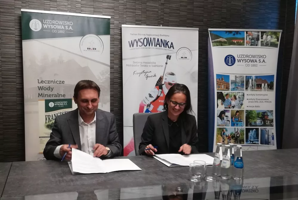 W samo południe w środę 27 listopada w Uzdrowisku Wysowa-Zdrój oficjalnie podpisano umowę o współpracy na kolejny sezon pomiędzy Wysowianką i Polskim Związku Bitahlonu. Podpisy na dokumencie złożyli Dagmara Gerasimuk 0 prezes Polskiego Związku Biathlonu oraz Wacław Furmanek - prezes Uzdrowiska Wysowa SA.