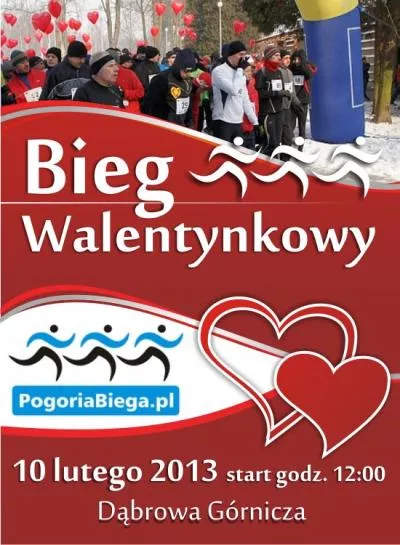 Ponadto nieustająco zachęcamy wszystkich zakochanych, bądź dopiero tęskniących za stanem zakochania, do niezwłocznego wpisywania się na coraz dłuższą listę startową II Biegu Walentynkowego i obmyślania niekonwencjonalnych strojów w duchu święta miłości, bo czasu już niewiele, a naprawdę warto puścić wodze fantazji oraz zaskoczyć komisję konkursową swoim pomysłem, gdyż najciekawiej przebrane pary, zarówno w konkurencji biegowej jak i nordic walking, zostaną nagrodzone: