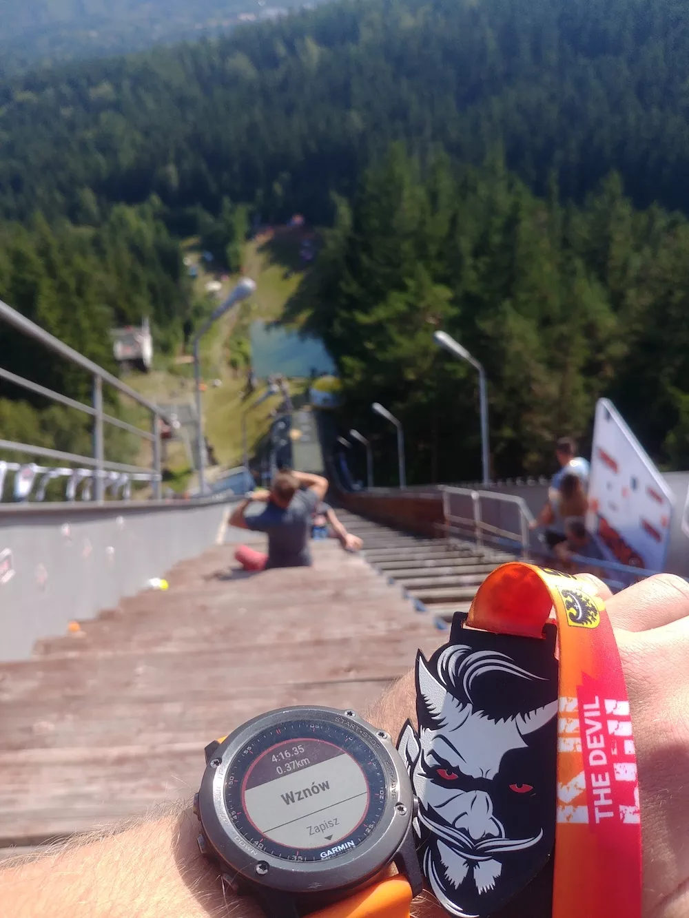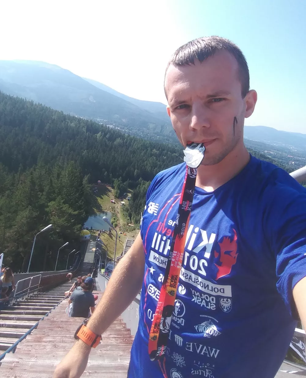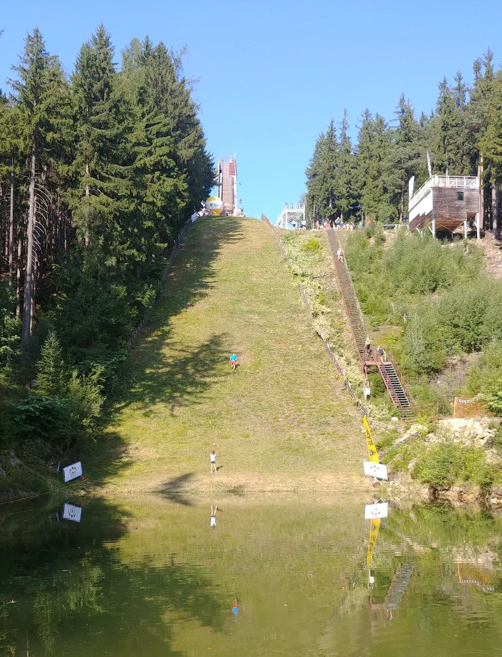 Dolnośląski triathlon, czyli zbieg, pływanie i podbieg na szczyt skoczni, łącznie jakieś 400 metrów w tym roku z najlepszym jak do tej pory czasem 4:17.