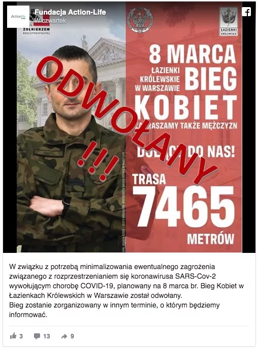 8 marca w Warszawie na terenie Łazienek Królewskich miał odbyć się Bieg Kobiet. Impreza została jednak odwołana.