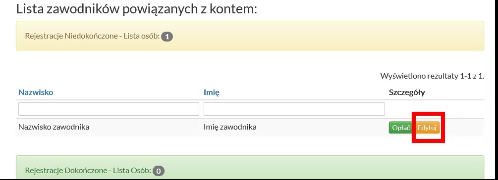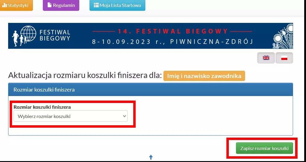 Osoby zarejestrowane, ale jeszcze nieopłacone, logują się na konto utworzone podczas rejestracji do panelu zawodnika. Następnie klikają przycisk „Edytuj” przy swoim zgłoszeniu/zgłoszeniach, zmieniają rozmiar koszulki i zapisują zgłoszenie.