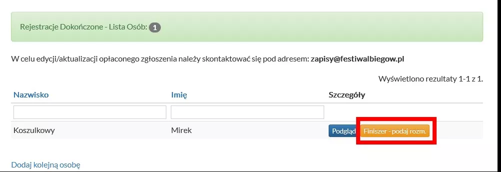 Z kolei osoby zarejestrowane i opłacone logują się na konto utworzone podczas rejestracji do panelu zawodnika a następnie klikają przycisk: „Finiszer – podaj rozmiar", wybierają go i zapisują zmianę.