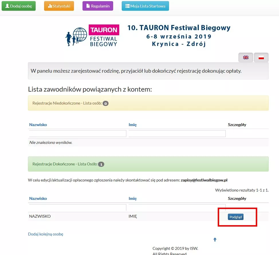 Widok przy wniesionej opłacie startowej: