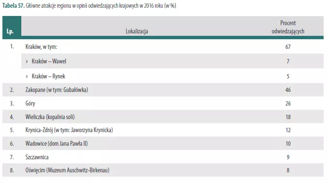 W 2016 roku Małopolskę odwiedziło 14,9 mln ludzi z czego 3,1 mln to turyści zagraniczni. W porównaniu do roku poprzedniego, województwo zanotowało wzrost przyjezdnych o prawie 7 proc. Szacunkowo, wszyscy turyści zostawili w naszym regionie zawrotną kwotę 13 mld złotych.