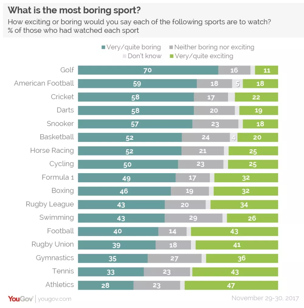 Zaskakujące wyniki przynosi sportowy sondaż prowadzony przez jeden z brytyjskich serwisów. Uczestnicy przyporządkowują w nim oceny - bardzo lub trochę nudne, bardzo lub trochę interesujące, ani nudne ani ekscytujące - do wskazanych dyscyplin.