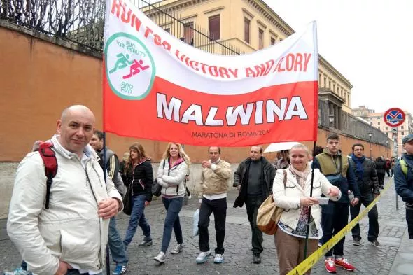 18. kilometr przypadał na Placu św. Piotra i to właśnie tam dołączył do mnie Mateusz. Zbliżając się do rodziców, wiedziałam tylko, że będą oni stali po lewej stronie ulicy. Już z daleka rzuciła mi się w oczy flaga Polski z napisem „MALWINA”. Dreszcze przeszły mnie po całym ciele. Nie wiedziałam, czy to z emocji, czy z zimna, bo znowu zaczął padać deszcz. 18 kilometrów w nogach, a ja cały czas w pełni sił.