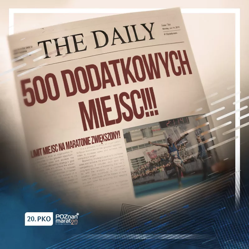 Już 20 października wystartuje 20. PKO Poznań Maraton im. Macieja Frankiewicza. Ogromne zainteresowanie jubileuszową edycją biegu spowodowało, że ustalony przez organizatorów limit zgłoszeń ponownie został zwiększony, tym razem o pule 500 dodatkowych numerów startowych.