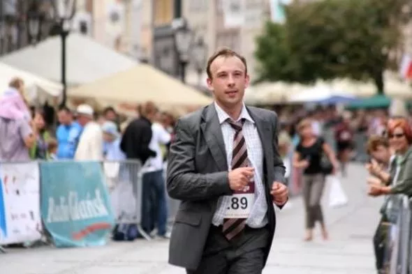 Później życie napisało trochę inny scenariusz i musiałem trochę odpuścić. Osiągając najsłabszy moment mojej biegowej przygody podczas Maratonu Solidarności, gdzie kompletnie nieprzygotowany zmierzyłem się z królewskim dystansem dla odmiany w moim codziennym stroju służbowym – ciemnym garniturze i to w iście upalnych warunkach (bez kryptoreklamy, ale garnitur wiodącej marki znad Wisły okazał się niezłym substytutem dla ciuchów biegowych, może nawet kiedyś spróbuję jeszcze w sezonie zimowym). Nie zapomnę do dziś wielkich braw nie tylko na mecie, ale praktycznie na całym odcinku trasy. W pewnym momencie nieświadomi pracownicy służb porządkowych nakazali mi, abym opuścił trasę, ponieważ to jest impreza biegowa. Dopiero, gdy spod krawata pokazałem numer startowy zareagowali uśmiechem i zapytali czy to nie ironiczna symbolika wyścigu szczurów.