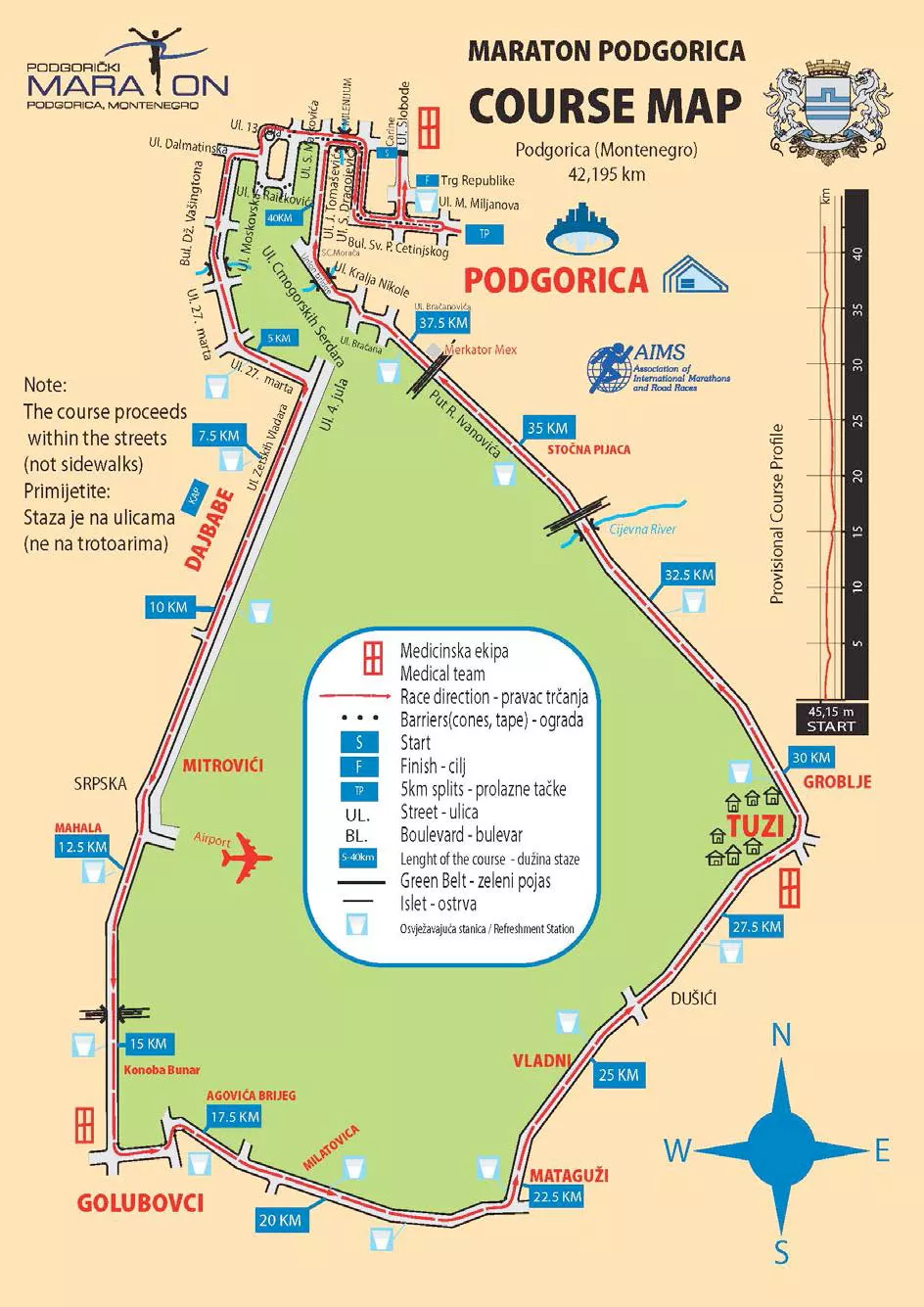 Jest płaska i w jednej pętli. Ma certyfikat AIMS. Bieg startuje i kończy się w Podgoricy na Placu Republiki. Przebiega po drodze przez miejscowości Mataguzi-Podgorica-Tuzi. Organizatorzy przewidzieli 15 punktów odświeżania.