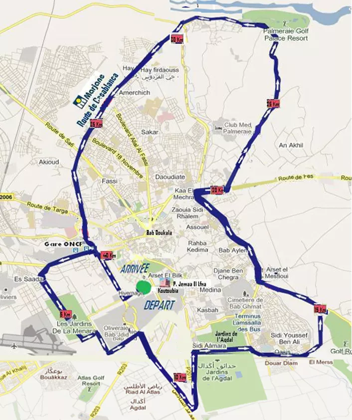 Składa się z jednej pętli, otacza miasto. Jest bardzo płaska i świetnie nadaje się do bicia rekordów życiowych (o ile nie przeszkodzi w tym różnica temperatur po przyjeździe z mroźnej Polski). Start i metę zaplanowano na alei Moulay Rachid. Trasa biegu prowadzi przez miasto, wzdłuż jego murów, szerokimi deptakami obsadzonymi palmami, później przed podmiejskie okolice, gaje oliwne i pastwiska wielbłądów. Przez jej fragment doskonale widoczne są ośnieżone Góry Atlas. Z pewnością jest niezwykle widokowo.