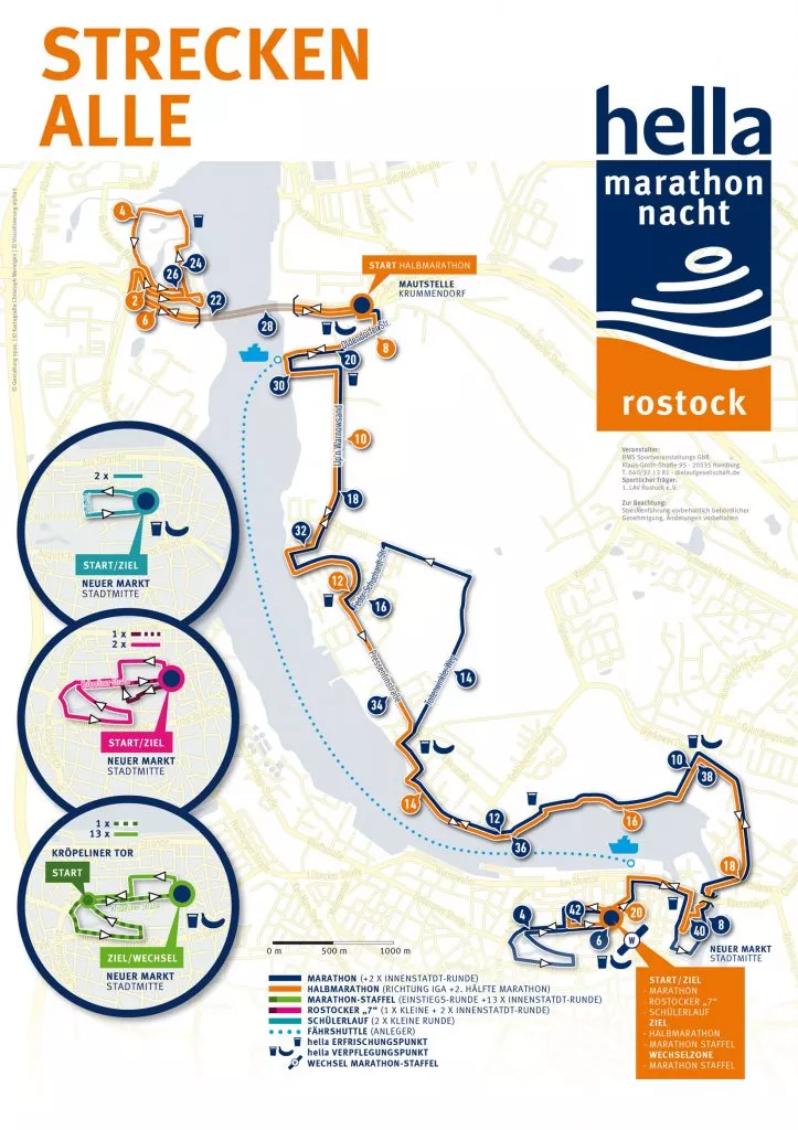 Jednocześnie z maratonem odbywa się wyścig sztafet maratońskich. Dwie godziny później u wlotu do tunelu pod rzeką Warnow startuje półmaraton. Organizatorzy zaplanowali także bieg towarzyszący o nazwie Rostocker 7.