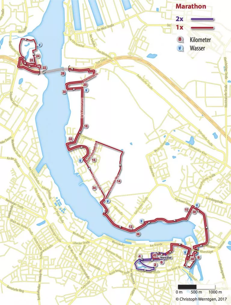Trasa jest certyfikowana (IAAF) i niemal w jednej pętli – zawodnicy dublują tylko krótki odcinek na początku trasy, dwukrotnie okrążając centrum. Dalej biegną na północ, w sporej części wzdłuż wybrzeża rzeki Warnow. Jedną z największych atrakcji trasy jest tunel pod rzeką, który maratończycy pokonają dwukrotnie – na 22 i 28 km trasy. Tunel mierzy 790 m i był pierwszym płatnym odcinkiem drogi publicznej na terenie Niemiec.