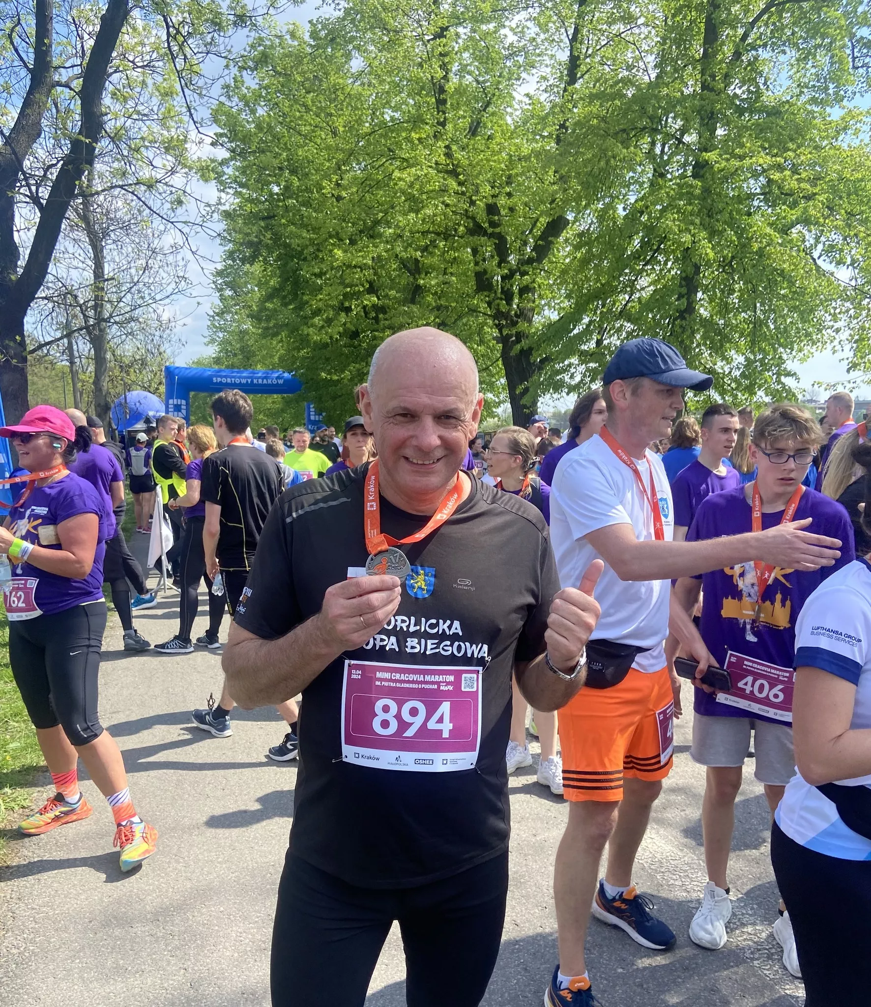 Pamiętam półmaraton w Radomyślu Wielkim, który wygrałem w swojej kategorii wiekowej, po czym nastąpiła długa przerwa. Do biegania wróciłem około 20 lat temu, dzięki bieżącym kontaktom ze wspaniałym środowiskiem biegaczy i… przybywającym z roku na rok kilogramom. Dzięki „biegowej cud-diecie”, zaczęły znikać.