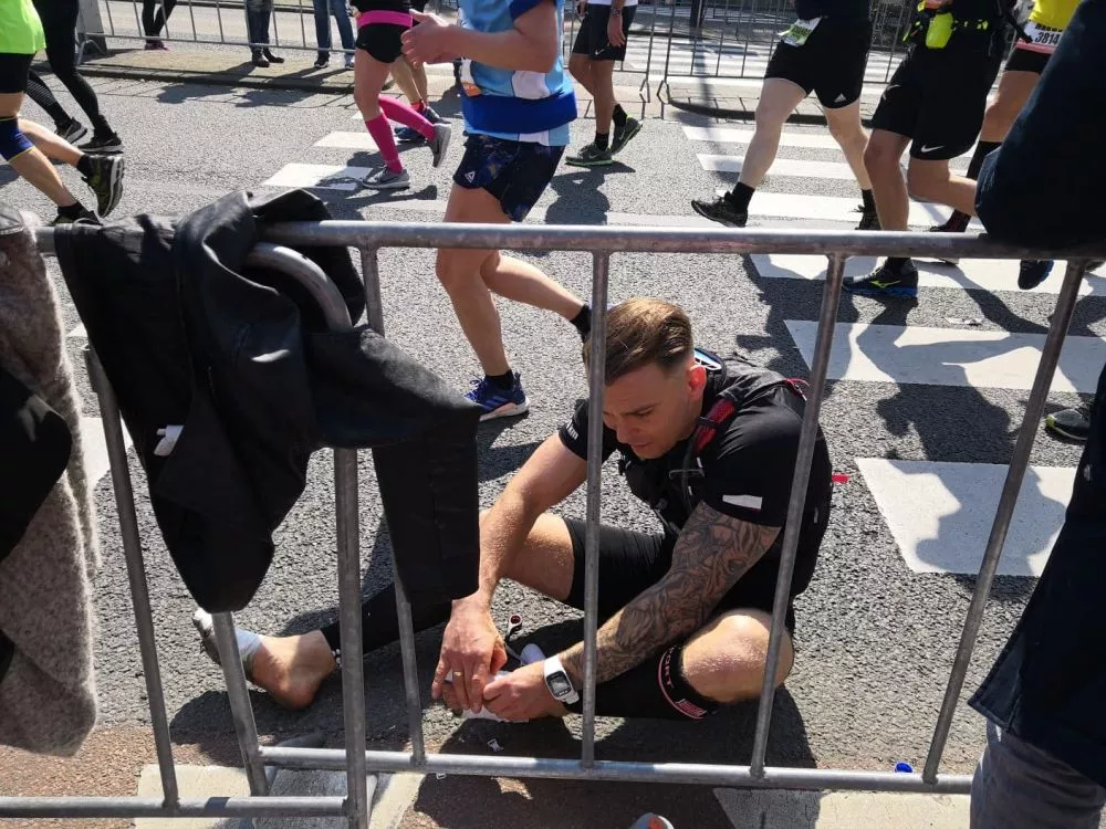 Kolejnym wyzwaniem była chęć sprawdzenia, jak to jest biegać boso. Dlatego też w kwietniu 2019 roku pobiegłem znów w Rotterdamie, ale tym razem bez butów. Pomimo rozciętych stóp udało mi się ukończyć z wynikiem 04:52.42.
