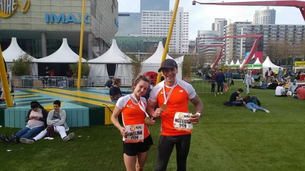 Moją pasją udało mi się zarazić żonę, która wraz ze mną pobiegła pierwszy półmaraton w Amsterdamie z wynikiem 1:53. Ja ukończyłem równocześnie odbywający maraton z czasem 03:22.51.