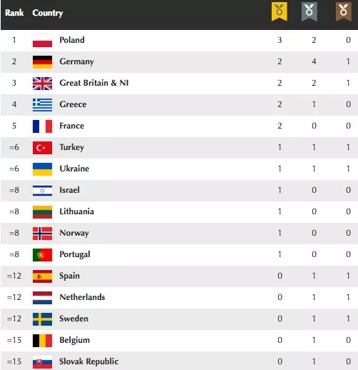 Polska prowadzi w klasyfikacji medalowej mając w dorobku 5 krążków: 3 złote i 2 srebrne. Na drugim miejscu plasują się Niemcy, którzy zdobyli do tej pory 7 medali, ale tylko 2 złote.