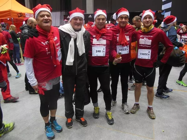 Temperatura lekko powyżej zera, powietrze ciężkie i wilgotne. Na start stawiło się ponad 400 osób wyczerpując limit miejsc. Większość w czerwonych czapkach Mikołaja. O 11:00 startujemy. 10min. wcześniej wystartowały panie czyli śnieżynki.