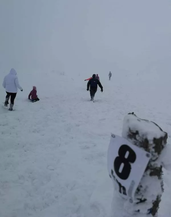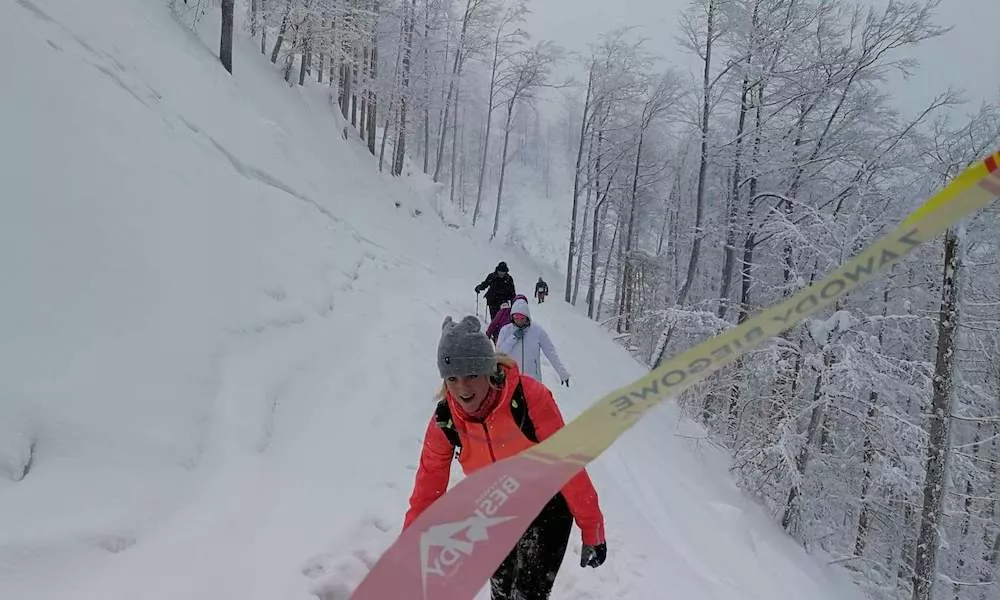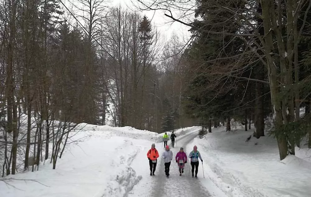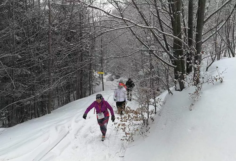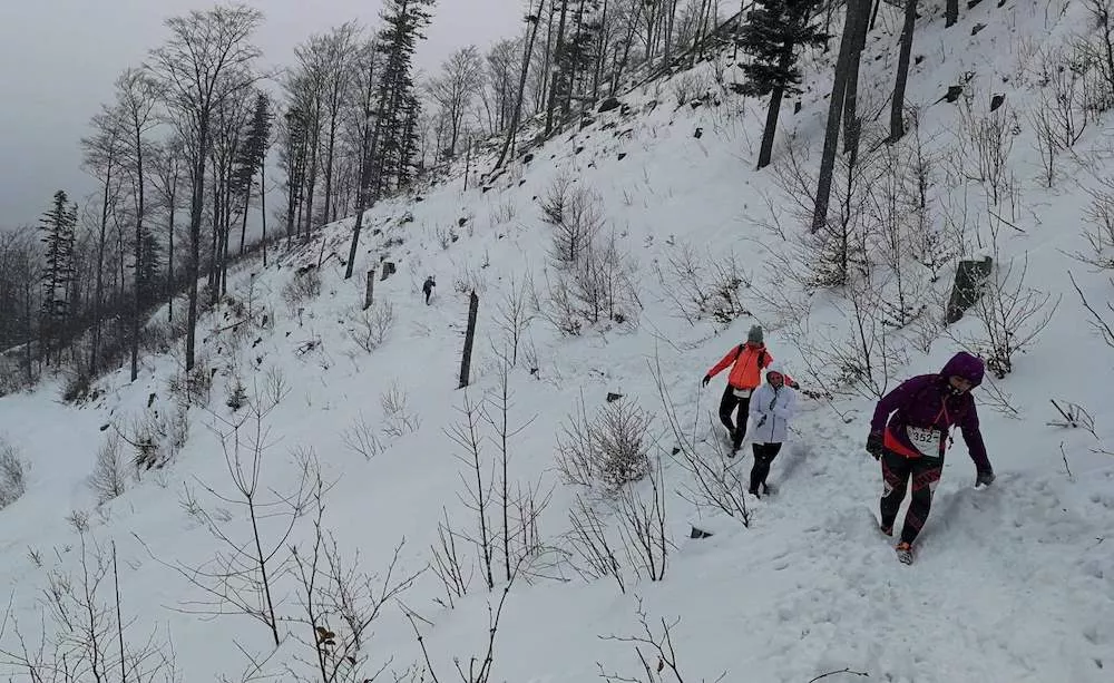 Bieg wystartował o 11 a razem z nim zaczął padać śnieg. Na początek przyjemny kilometr po płaskim i zaczynają się schody... A właściwie to podbiegi. Zalegający śnieg przypominał sypiący się cukier. Wydeptane ślady po chwili zasypywały się ponownie.