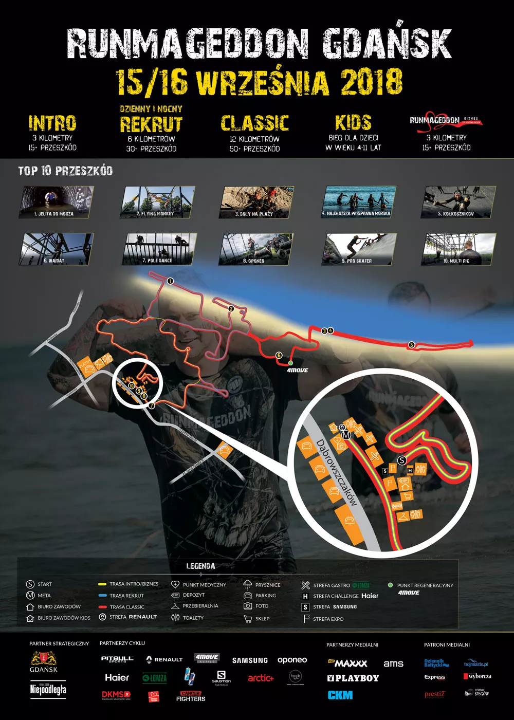 Inżynierowie Runmageddonu już od początku tygodnia przygotowują trasy, a Organizatorzy uchylają rąbka tajemnicy na temat przeszkód, z którymi będą musieli zmierzyć się odważni uczestnicy biegu. Doły na plaży, Jelita prosto do morza, Pole Dance czy Oponeo to przeszkody, które są już dobrze znane Runmageddończykom. Na trasach w Gdańsku pojawi się też Kołkownica, Wariat, Flying Monkey i Multirig. Na uczestników czeka Najdłuższa przeprawa wśród wód Morza Bałtyckiego. Swój wielki powrót na trasy Runmageddonu podczas eventu w Gdańsku zaliczy Pro skater czyli rampa, która na codzień służy do akrobacji na deskorolce. Zawodnicy będą musieli na nią wbiec, a zejście ułatwi im kratownica, która umieszczona będzie z jej drugiej strony.