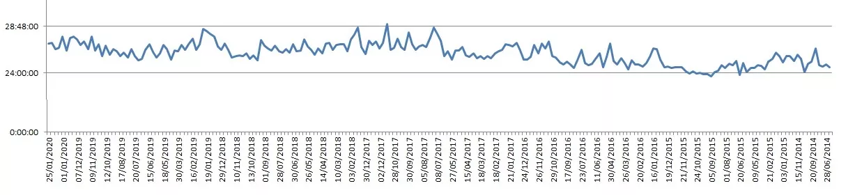W ciągu tego okresu trasa stołecznego biegu była zmieniona z dwóch kołek po 2,5 km na jedno 5 km. Moje wyniki okazują się dosyć stabilne, pomiędzy 23:38 a 26:26.