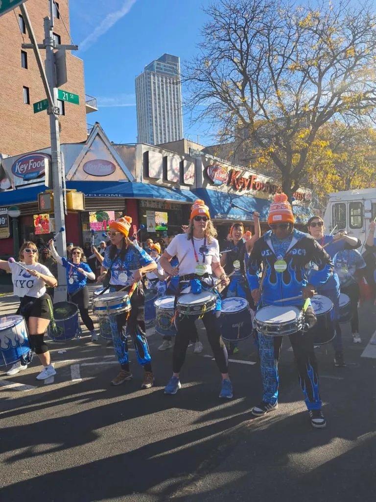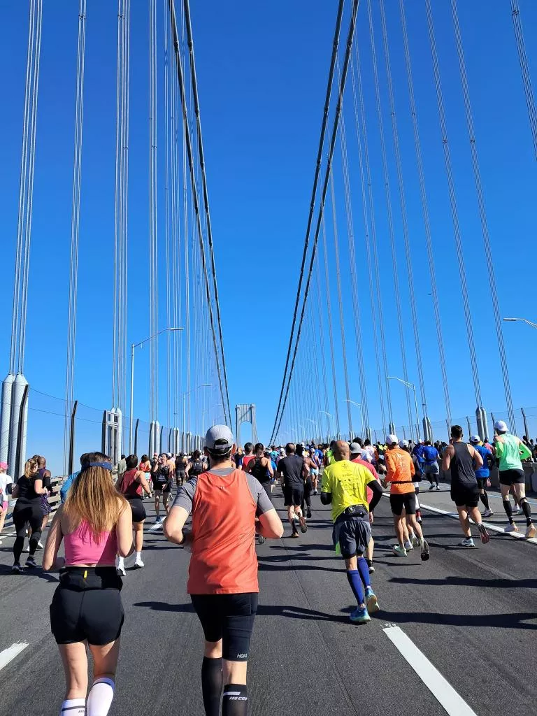 Dzień startu to ogrom wrażeń, który daje takiego kopa, że zapominam o niewyspaniu i zmęczeniu. Polska grupa, której częścią jestem, płynie promem, później przy wielkiej uciesze jedzie żółtymi „school bus-ami”. Po około godzinie docieramy do miasteczka biegowego. Wszyscy uczestnicy są podzieleni na kolory – wioski, fale i literowe corrale. Wydaje się to skomplikowane ale organizacja jest super. W drodze do swojej strefy pijemy kawę i jemy bajgle. Pogoda wymarzona – temperatura ok. 12 stopni i świeci słońce. Przed wejściem do przypisanego corralu można zrzucić ciepłe ubrania, w których się przyjechało a które zbierane są dla organizacji charytatywnych. Miejsce startu maratonu nowojorskiego robi wrażenie. Biegacze ustawiają się na dwóch poziomach mostu Verrazzano-Narrows Bridge, z którego roztaczają się widoki na port i panoramę Nowego Jorku, w tym na Statuę Wolności. Po wysłuchaniu amerykańskiego hymnu narodowego startujemy. Most Verrazzano ma ok. 2 mile długości i na początek biegu funduje wspinaczkę pod górę. Z kolei zbieg prowadzi prosto do Brooklynu, na którym rozpoczyna się show, którego odgłosy słychać z oddali, a którego próżno szukać na biegach w Polsce. Tłumy kibiców, ogromny krzyk, śpiewy, doping, zespoły, bębniarze, głośna muzyka, wiwaty, flagi…… Trudno opisać tą wrzawę, która trwa od Brooklynu, przez Queens, Bronx, Manhattan aż do samej mety przez kilka godzin trwania maratonu, z przerwami na mostach, na których jest zakaz kibicowania. Adrenalina niesamowita! Zapominam o zmęczeniu i bolących po zwiedzaniu miasta nogach i płynę na falach tego aplauzu, czując się jak gwiazda filmowa na oscarowym dywanie.