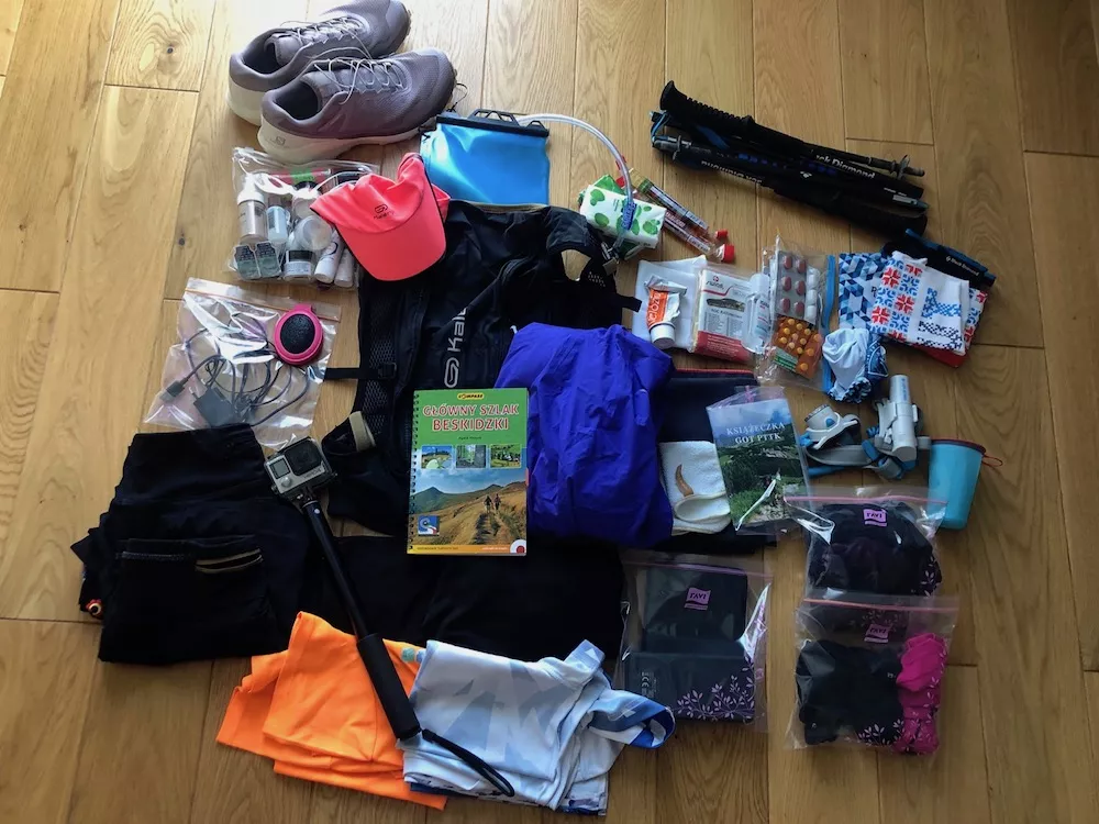 - plecak biegowy Kalenji 15 l, bukłak 2l, kubek silikonowy, 2 x bluzka z krótkim rękawem, 2 x spódniczka biegowa, 1 x legginsy biegowe, 1x bluzka z długim rękawem, kurtka przeciwwiatrowa i przeciwdeszczowa, 2 x skarpetki, 1 x skarpetki kompresyjne CEP, 2 x stanik biegowy, 2 x bielizna osobista, 2 x buff, 1 czapka z daszkiem, rękawki biegowe, japonki, kosmetyczka, ręcznik, opaska na kolano, apteczka, 2x maść przeciwbólowa, czołówka, powerbank, telefon, kable do ładowania, przewodnik z mapami, niewielką ilość proszku do prania, folia NRC, kijki biegowe, baton, saszetki z kawą/herbatą (kilka sztuk), żelki, chusteczki higieniczne, środek na komary, obuwie biegowe.