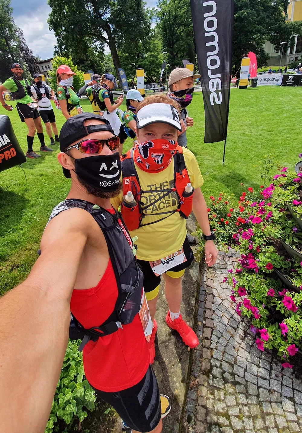 Na start w Lądku przyjechaliśmy troszkę szybciej, wiadomo, trzeba na spokojnie się przygotować i rozgrzać przed biegiem. Słońce mocno świeciło i było to wyraźnie odczuwalne, choć z chwili na chwilę wyglądało, że może to być zbyt optymistyczna prognoza. Ostatnie rozmowy, „kopniak” szczęścia od mojej Karoli i w dobrych nastrojach, z maseczkami na twarzy, udaliśmy się ze Staszkiem do wyznaczonej strefy. Kolega startuje 10 sekund przede mną. Końcowe odliczanie i ruszam w trasę. Na pierwszych 100 m głośne okrzyki kibiców i Karoli, która robi mi zdjęcia.