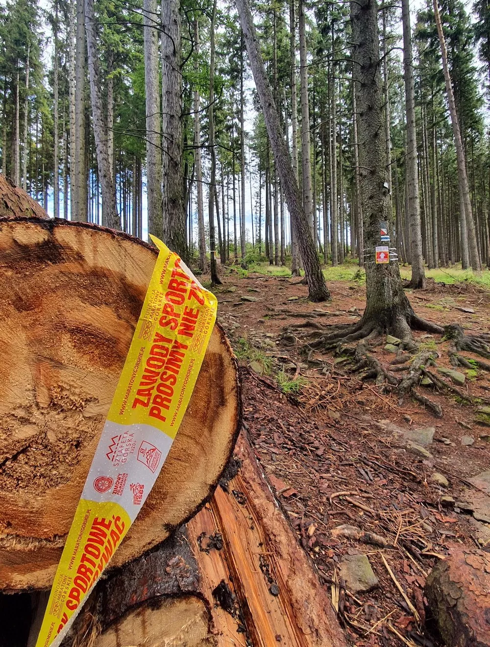 Na około 26 kilometrze tą optymistyczną atmosferę zakłóca mój nagły spadek sił. Moja moc odfrunęła gdzieś w niebyt i czuję brak sił, co więcej podbiegi i chaszcze nie pomagają. Postanawiam poczęstować się jeszcze jedną dawką żelowego wsparcia, cóż mam do stracenia. Ten stan trwa około 2 kilometry i tuż przed ostrym skrętem w kierunku ruin zamku Karpień jest już dobrze. Przed samym zakrętem wołam biegnącego przede mną biegacza, który nie zauważył oznaczonego skrętu i pobiegł prosto. To część trasy, którą jeszcze chwilę wcześniej biegliśmy w przeciwnym kierunku. Teraz trzeba się tylko wdrapać pod Skalną Bramę i można zbiegać w kierunku Lądka.