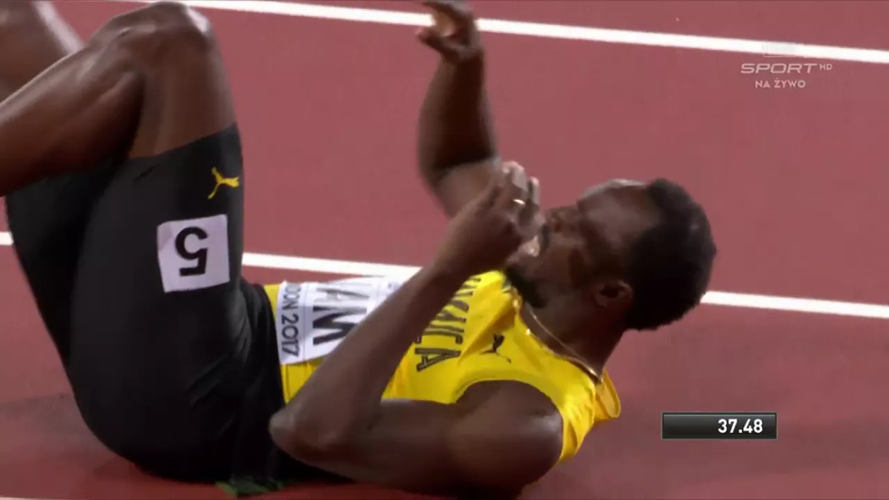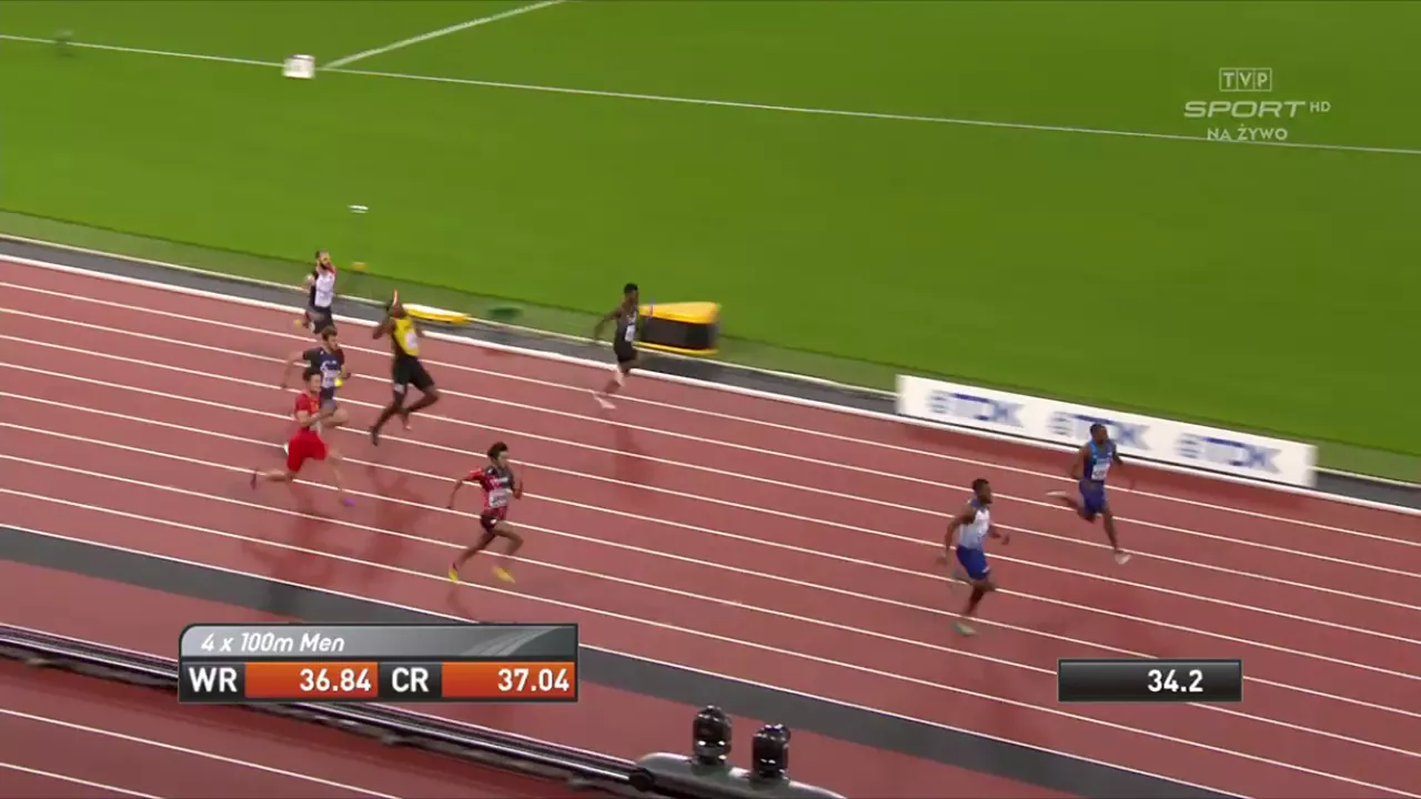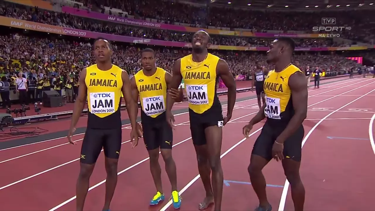 Bolt wszedł w rywalizację na trzeci miejscu ze sporą szansą dogonić prowadzących Amerykanów i Brytyjczyków. Niestety po pokonaniu 30-40 metrów złapał się za udo, a po chwili upadł na bieżnię.