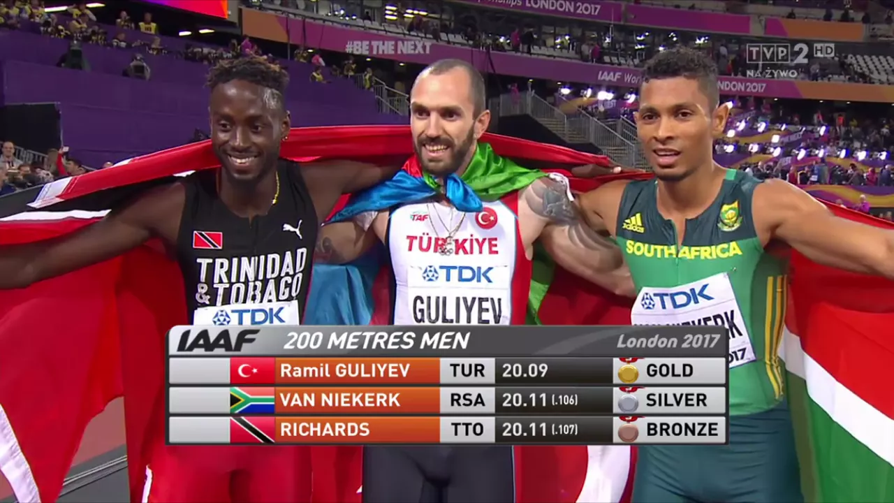Na 30 metrów przed metą prowadził jeszcze van Niekerk, mistrz świata na 400m sprzed kilkudziesięciu godzin, ale to Guliev rozkręcił najmocniej turbosprężarkę i sensacyjnie pokonał faworyta (czas na mecie 20.09 s.).
