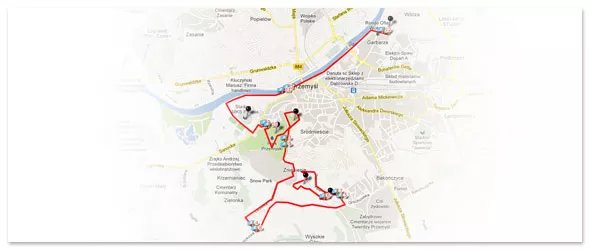 Bieg rozpoczynamy od Galerii Sanowej przy ulicy Brudzewskiego. Biegniemy w kierunku wschodnim, mijamy Rondo Ofiar Wołynia i następnie wzdłuż Sanu. Na 3 kilometrze przebiegamy obok stadionu Polonii Przemyśl, na którym można zrobić trening interwałowy. Tu zostawiamy San i skręcamy na południowy wschód, wzdłuż stadionu. Dobiegamy do ulicy Sanockiej - tu skręcamy w lewo do wejścia do Parku Miejskiego. W parku jest wiele podbiegów i zbiegów doskonałych do krosu. Po wybiegnięciu na wzniesienie czyli tak zwaną Zielonkę, możemy podziwiać ładne widoki na Przemyśl i Dolinę Sanu. Następnie trasa wiedzie ulicami Pasteura, Ziemowita, Grochowską do Przemysława, która dobiegamy do parkingu na Zniesieniu. Za nim wbiegamy na Ścieżkę na Zniesieniu którą dobiegamy do Kopca Tatarskiego.