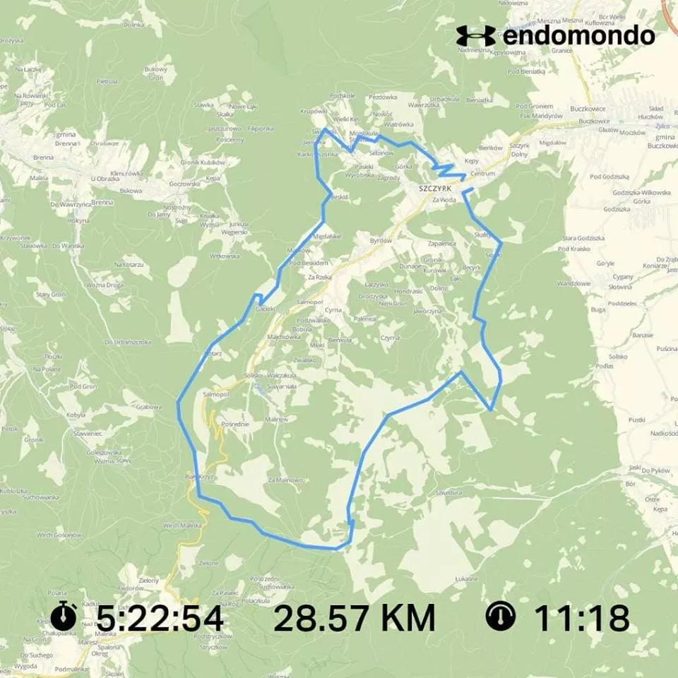 Ten początek taki średni, okazał się jednak najłatwiejszy w całym biegu. Trasa wytyczona była wokół Szczyrku. Biegliśmy od Amfiteatru na Karkoszczonkę, Kotarz, Salmopol, Malinów, Malinowską Skałę aż do Skrzycznego. Stamtąd zbiegaliśmy trasą Zamieci aż do mety. W sumie wyszło to trochę więcej, bo 28,5 kilometra i 1250m + przewyższenia! Profil trasy tylko z pozoru wygląda niewinnie.