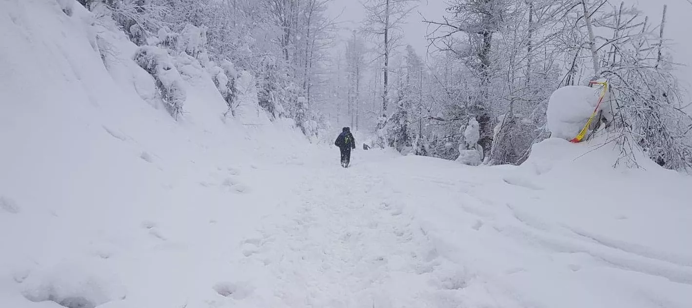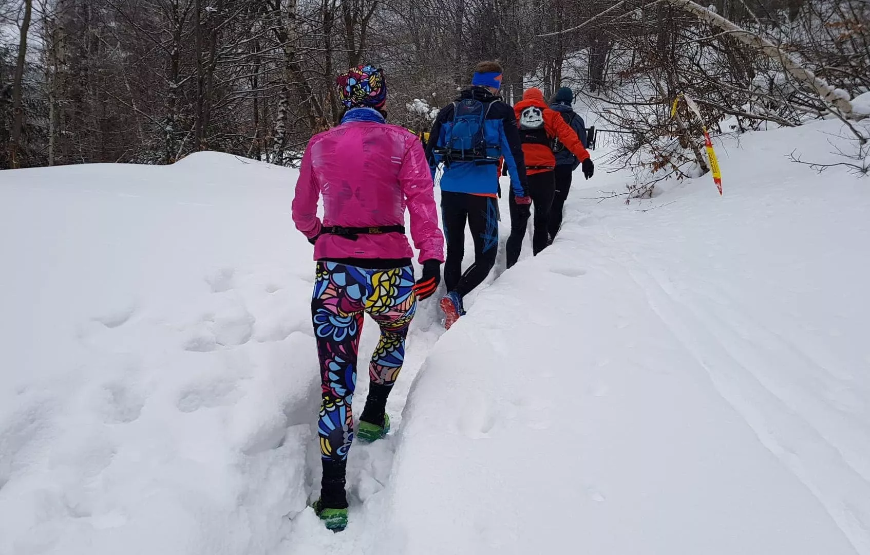 Najgorszy odcinek prowadzi od Salmopolu na Skrzycze. Ciągłe skipy w śniegu po kolana to była pestka i właściwie normalka w biegu górskim zimą, ale najgorsza okazała się śnieżyca – w rejonie Malinowskiej Skały. To teren zupełnie odsłonięty, gdzie wiatr hula w każdą stronę, a jego podmuchy dochodzą nawet do 100 km/h (może i więcej). W kilka minut przemarzałam do szpiku kości. Nie dało się tam biec, bo nogi zapadały się po kolana, w dodatku grupa biegaczy, którą wyprzedziłam na Salmopolu zniknęła mi z pola widzenia. Przede mną była już tylko jedna osoba.