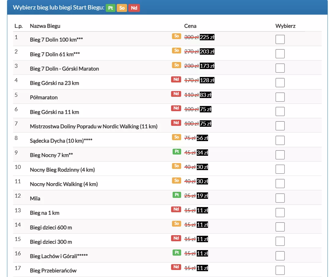 Dla przykładu - koszt Biegu na 100 km to 225 zł (wcześniej 300 zł), na 61 km - 203 zł (wcześniej 270 zł), półmaratonu - 83 zł (wcześniej 110 zł), Sądeckiej Dychy - 56 zł (wcześniej 75 zł). Sami widzicie zatem, że ceny są dużo niższe!