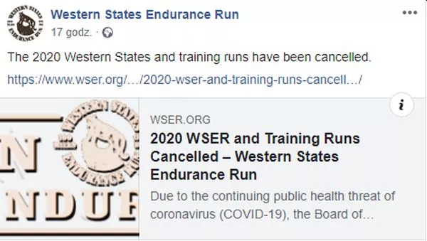Coraz więcej biegowych imprez znika z kalendarza startów. Po wysypie odwołanych biegów z terminami na marzec i kwiecień, teraz przyszła kolej na te późniejsze. Najstarszy ultramaraton na świecie, rozgrywany na dystansie 100 mil również się w tym roku nie odbędzie. Organizatorzy Western States Endurance Run 100 odwołali zaplanowany na koniec czerwca bieg.