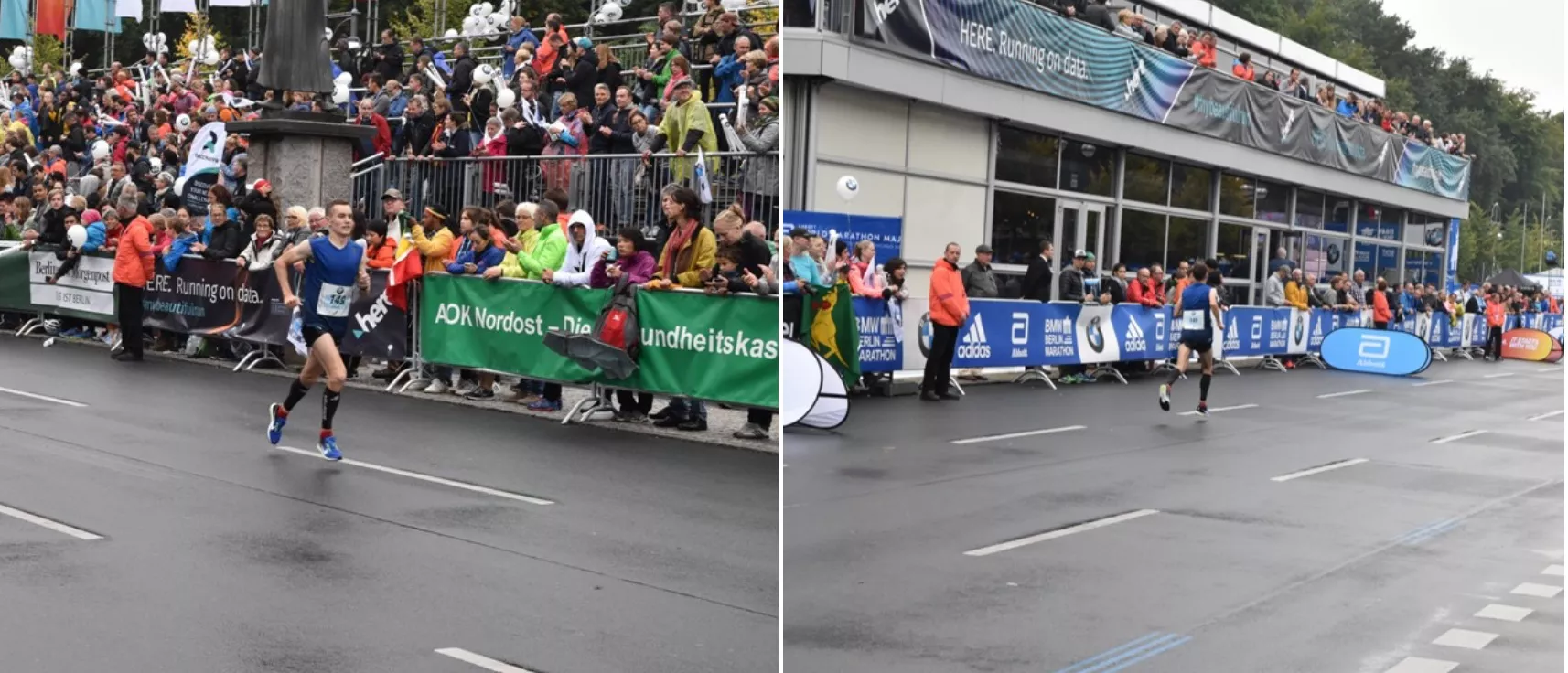 35 km w 1:57:11. Słabizna. Łapałem się już na granicy 2:20-21. Momentami czułem jakbym szedł. Jeden z kilometrów po około 3:45-46 między dwoma słupkami. Byłem załamany. Gdzieś na trasie widziałem telebim z relacją na żywo. Kipchoge był pierwszy. Dobiegał do Bramy Brandenburskiej. Miał po przebiegnięcia jakieś 300-400 metrów. Czas na poziomie 2:02:15. Wiedziałem, że rekordu nie będzie. Szybko wykalkulowałem czas w okolicach 2:03:30-40. Już tylko chciałem 38 km. Potsdamer Platz, historyczny, z szerokimi ulicami. Byłem już coraz bliżej. Starałem się wykrzesać nowe pokłady sił. Koło 39 km lekko przyspieszyłem. W końcu byłem bardzo blisko…