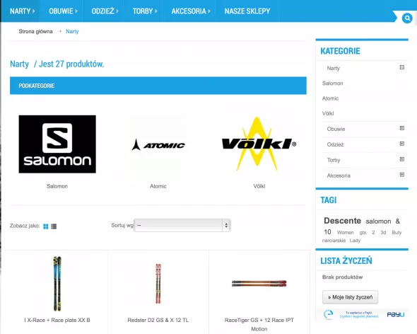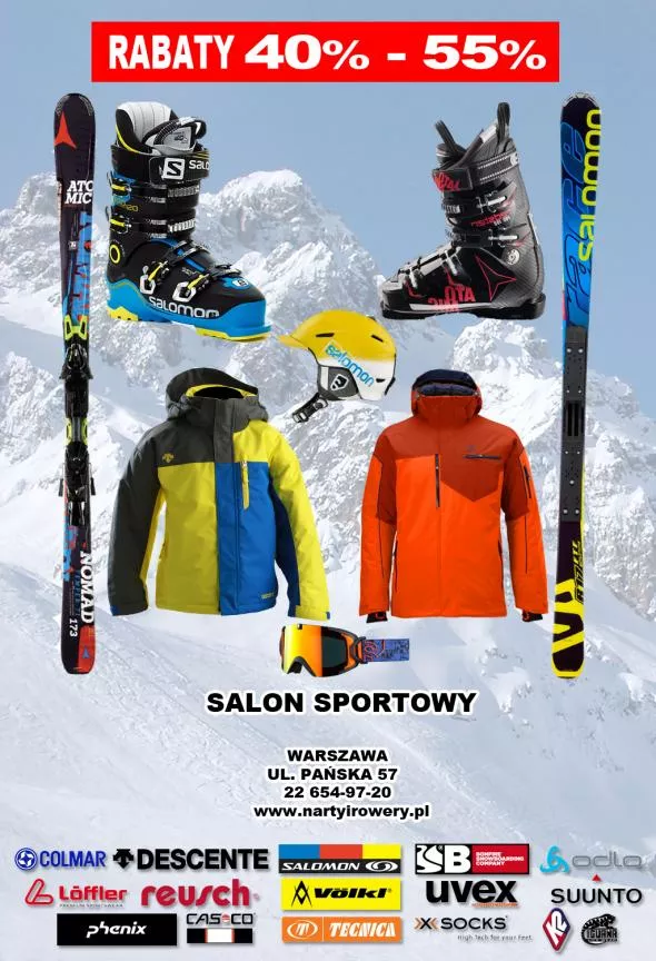 - nart, wiązań, butów narciarskich takich firm jak: Salomon, Atomic, Fischer, Volkl, Blizzard, Head, Tyrolia, Marker.