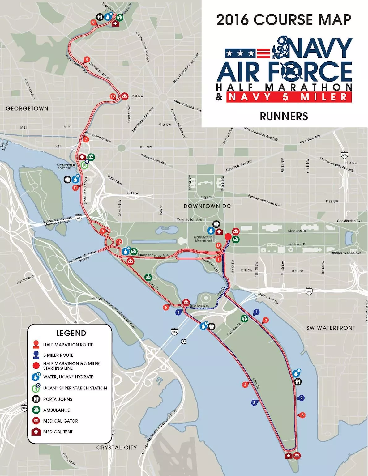 Navy-Air Force Half Marathon był jednym z najciekawszych biegów ulicznych w mieście Waszyngton. Bieg na głównym dystansie prowadził wzdłuż słynnych pomników II Wojny Światowej, Weteranów Wojny Koreańskiej, Thomasa Jeffersona, Abrahama Linconla czy cmentarza wojskowego w Arlington. Uczestnicy biegli wzdłuż rzeki Potomac, przekraczając ją m.in. słynnym Mostem Pamięci (Memorial Bridge).