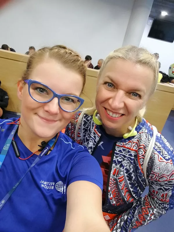Przed wbiegnięciem do Parku Śląskiego przybijam piątkę z moją wychowawczynią z liceum - świetna biegaczka!