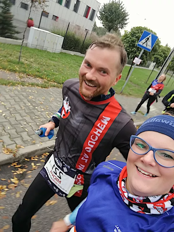 W niedzielny poranek razem z Mateuszem kolegą z Kuźni pojechaliśmy na start biegu. W biegach „u siebie” fajne jest to, że wszędzie są znajomi. Przed startem dostałam masę wiadomości od przyjaciół, którzy cały czas mnie wspierali. Od wejścia na stadion spotkałam całą masę znajomych. Na start udałam się z Adamem, miła rozmowa, wzajemne wsparcie obniżyły mój stres.