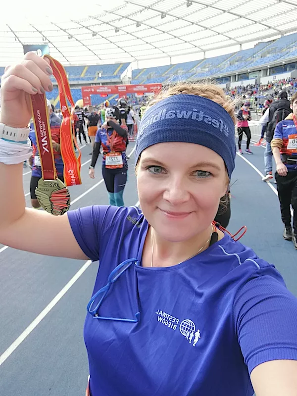 Ostatnie kilkaset metrów to był bieg sercem - jeśli nie własnym to sercem kibiców. Mimo, że do Stadionu droga wiodła pod górkę, nie odczuwałam tego. Wśród kibiców dostrzegłam Dominikę i Filipa z córką - to był zastrzyk energii który niósł mnie do mety. Pozostało tylko wbiec na stadion i do mety.