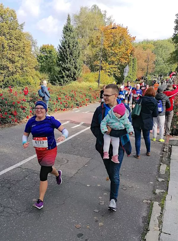 Na 18. kilometrze zaczęłam przechodzić do marszu, bolały mnie nogi. Nie pomagał fakt, że zegarek wskazywał inny dystans niż flagi. Trochę licytując się sama z sobą, biegłam. Otuchy dodało mi pojawienie się Pawła na trasie który biegł maraton, miał w sobie tyle zapału i energii, że obdarowały by połowę startujących.