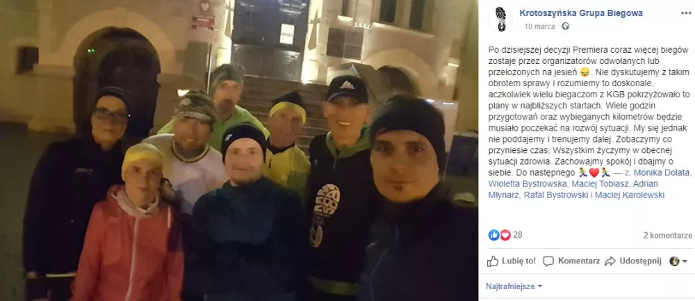 „Nieciekawa sytuacja, którą wszyscy doskonale znamy zmusza nas do czasowego zawieszenia naszych spotkań. Pamiętajmy, że dla nas bieganie jest często ważnym, ale jednak dodatkiem do życia, dzięki któremu mamy być zdrowsi i bardziej szczęśliwi. Jeżeli zachodzi prawdopodobieństwo (nawet niewielkie), że skutek będzie odwrotny, to nie należy ryzykować” – uważają.
