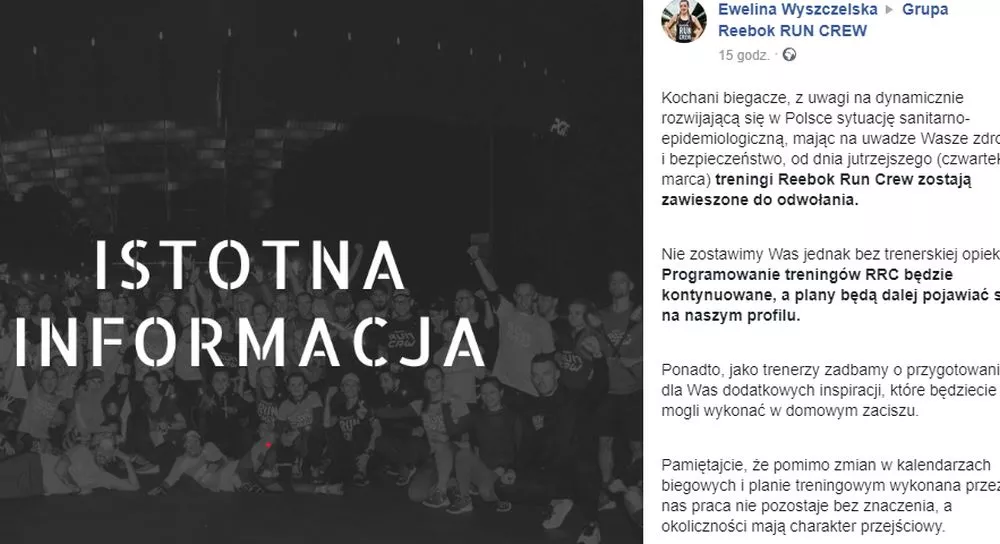 W Reebok Run Crew nie mieli wątpliwości i odwołali treningi grup rozsianych po całym kraju. „Kochani biegacze z uwagi na dynamicznie rozwijającą się w Polsce sytuację sanitarno-epidemiologiczną, mając na uwadze Wasze zdrowie i bezpieczeństwo, od dnia jutrzejszego (czwartek, 12 marca) treningi zostają zawieszone do odwołania.” – poinformowali na facebooku.
