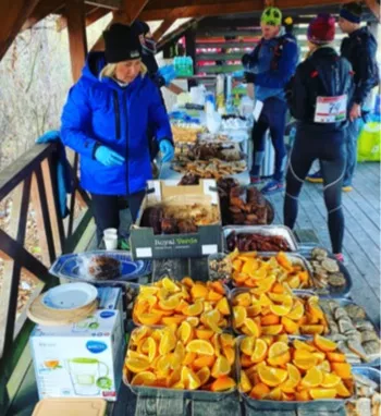 Jeden punkt żywieniowy, tak zwany „paśnik” ulokowano w strategicznym miejscu na Przełęczy Tąpadła tam gdzie start i meta oraz zbieg z wierzchołka Ślęży. Na początku pomyślałem, że jeden punkt żywieniowy na takim dystansie to mało, jednak gdy zacząłem biec i zobaczyłem jak cała impreza jest zorganizowana, to przekonałem się, że po każdym wbiegnięciu na Ślężę innym szlakiem, będziemy zbiegać tą samą drogą z możliwością skorzystania z „paśnika”.