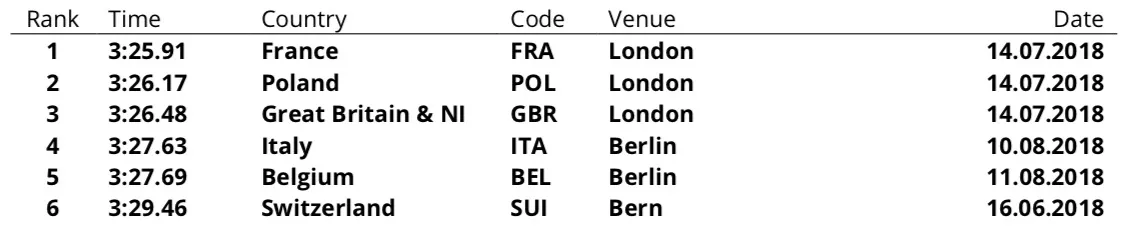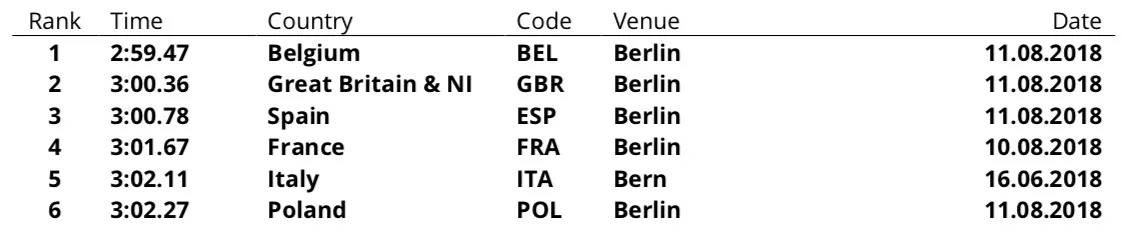 Najlepszy wynik w sezonie 2018 na stadionie uzyskali Belgowie – 2:59.47, złoci medaliści ME w Berlinie. Polacy uplasowali się na szóstym, a więc ostatnim miejscu dającym przepustkę na HME, z wynikiem 3:02.27 z ME w Berlinie, gdzie nasz zespół zajął piąte miejsce.