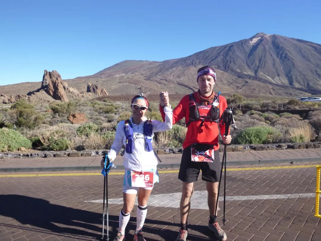 Wydostajemy się od południa na grzbiet starej kaldery wulkanu i wchodzimy w zasięg słońca. Pod nogami na przemian kamienie i osuwający się, wulkaniczny piach. Jest 8:00, czyli Olga właśnie startuje. Na długim podejściu na ponad 2400 m n.p.m. jestem już fizycznie zmęczony. Wyprzedzają mnie nie tylko niebiescy, którzy zaraz odbiją w prawo, ale i kilku czerwonych. Zza grzbietu wreszcie wyłania się moja ulubiona kupa żużlu – Jego Wysokość Teide. Na stromym zbiegu odzyskuję kilka miejsc, ale do przepaku mamy jeszcze spory kawałek szutrem.