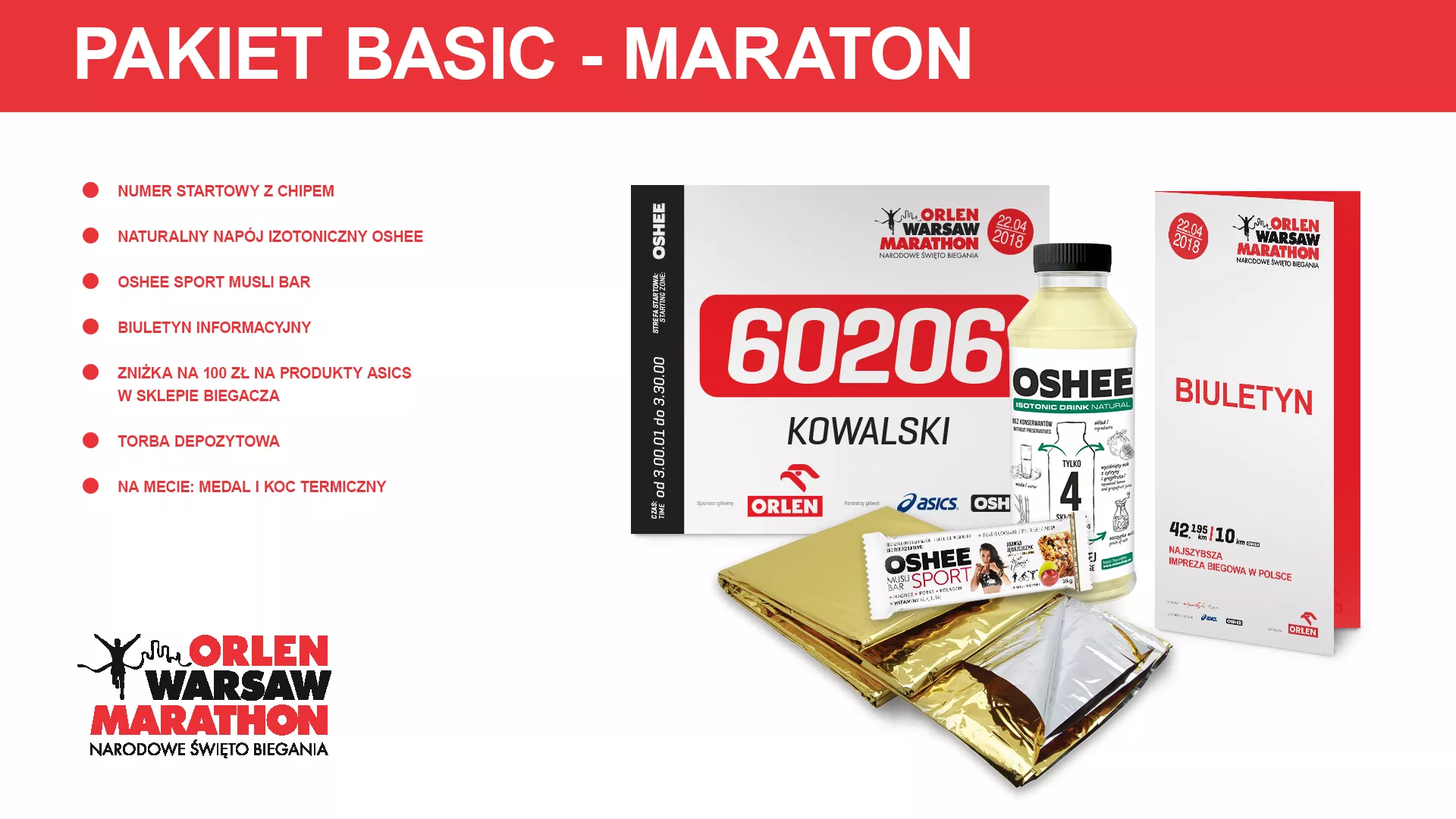 Maratończycy w swoich pakietach Basic również znajdą numer startowy, chip, napój izotoniczny, batonik, biuletyn oraz kupony zniżkowe.